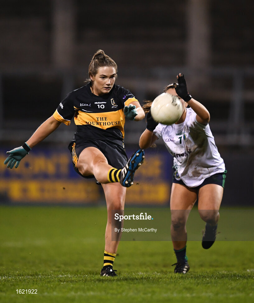 8 December 2018; Eimear Harrington of Mourneabbey in action against Lorna Fusciardi of Foxrock-Cabinteely during the All-Ireland Ladies Football Senior Club Championship Final match between Mourneabbey and Foxrock-Cabinteely at Parnell Park in Dublin. Photo by Stephen McCarthy/Sportsfile