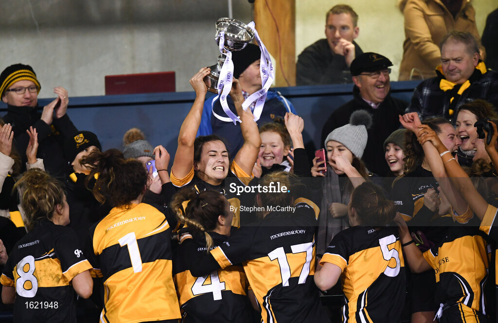 8 December 2018; Brid O'Sullivan of Mourneabbey lifts the Dolores Tyrrell Memorial Cup following the All-Ireland Ladies Football Senior Club Championship Final match between Mourneabbey and Foxrock-Cabinteely at Parnell Park in Dublin. Photo by Stephen McCarthy/Sportsfile