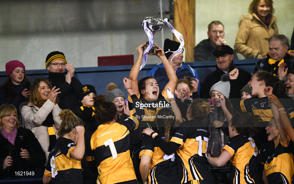 8 December 2018; Brid O'Sullivan of Mourneabbey lifts the Dolores Tyrrell Memorial Cup following the All-Ireland Ladies Football Senior Club Championship Final match between Mourneabbey and Foxrock-Cabinteely at Parnell Park in Dublin. Photo by Stephen McCarthy/Sportsfile