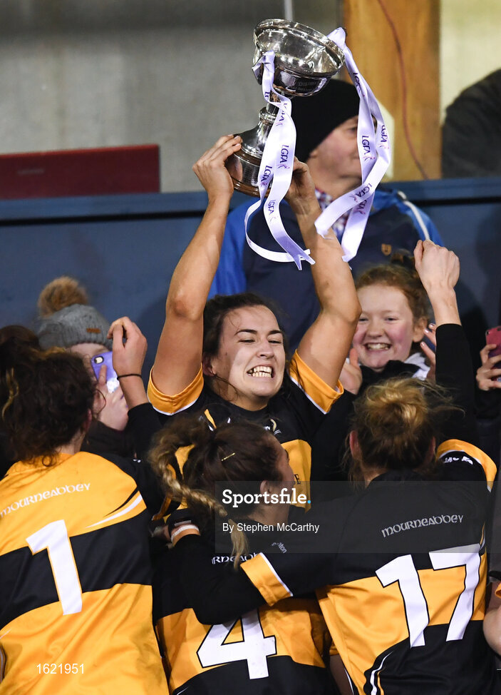 8 December 2018; Brid O'Sullivan of Mourneabbey lifts the Dolores Tyrrell Memorial Cup following the All-Ireland Ladies Football Senior Club Championship Final match between Mourneabbey and Foxrock-Cabinteely at Parnell Park in Dublin. Photo by Stephen McCarthy/Sportsfile