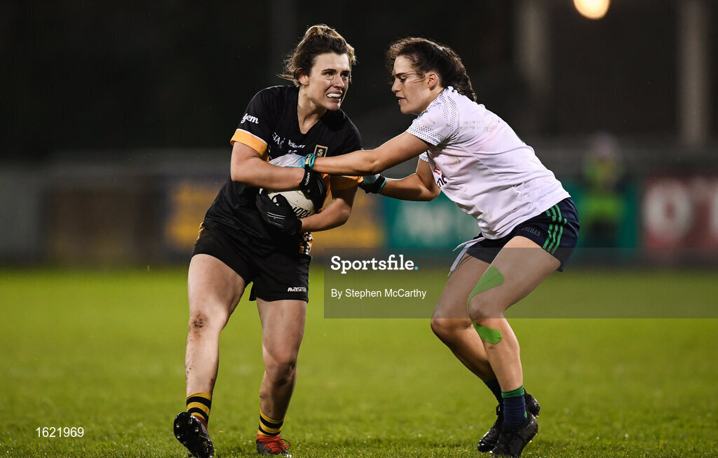 8 December 2018; Doireann O'Sullivan of Mourneabbey in action against Emma McDonagh of Foxrock-Cabinteely during the All-Ireland Ladies Football Senior Club Championship Final match between Mourneabbey and Foxrock-Cabinteely at Parnell Park in Dublin. Photo by Stephen McCarthy/Sportsfile