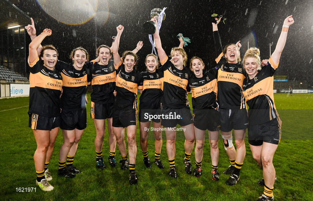 8 December 2018; Mourneabbey players celebrate with the Dolores Tyrrell Memorial Cup following the All-Ireland Ladies Football Senior Club Championship Final match between Mourneabbey and Foxrock-Cabinteely at Parnell Park in Dublin. Photo by Stephen McCarthy/Sportsfile