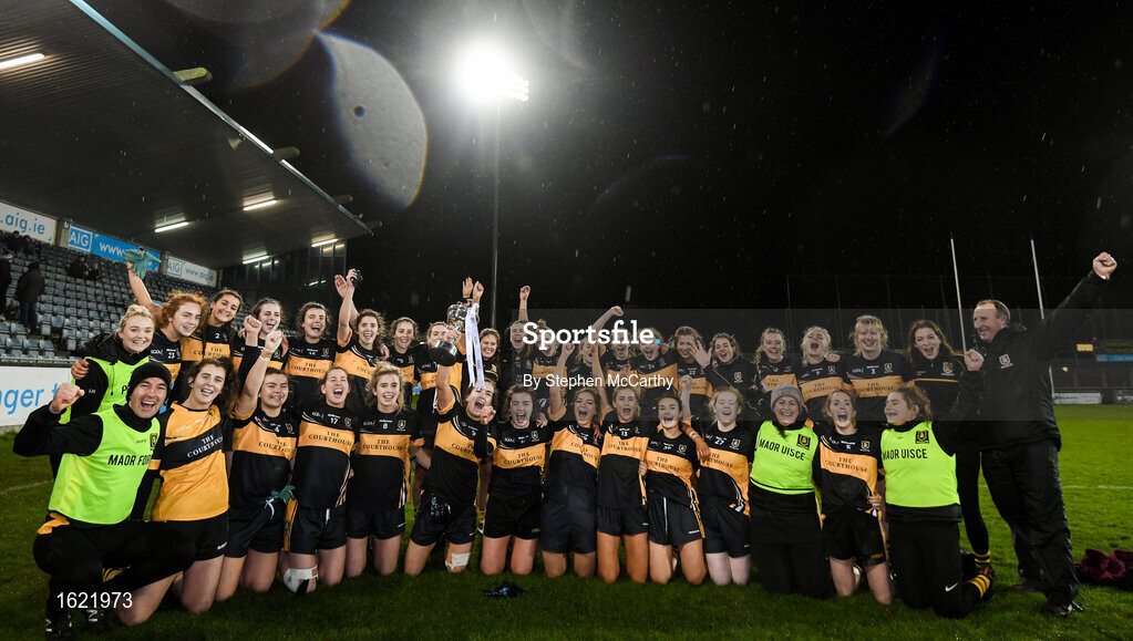 8 December 2018; Mourneabbey players and staff celebrate with the Dolores Tyrrell Memorial Cup following the All-Ireland Ladies Football Senior Club Championship Final match between Mourneabbey and Foxrock-Cabinteely at Parnell Park in Dublin. Photo by Stephen McCarthy/Sportsfile