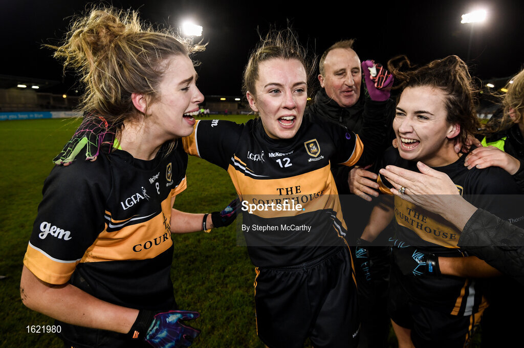 8 December 2018; Mourneabbey players, from left, Marie O'Callaghan, Niamh O'Sullivan and Brid O'Sullivan celebrate following the All-Ireland Ladies Football Senior Club Championship Final match between Mourneabbey and Foxrock-Cabinteely at Parnell Park in Dublin. Photo by Stephen McCarthy/Sportsfile