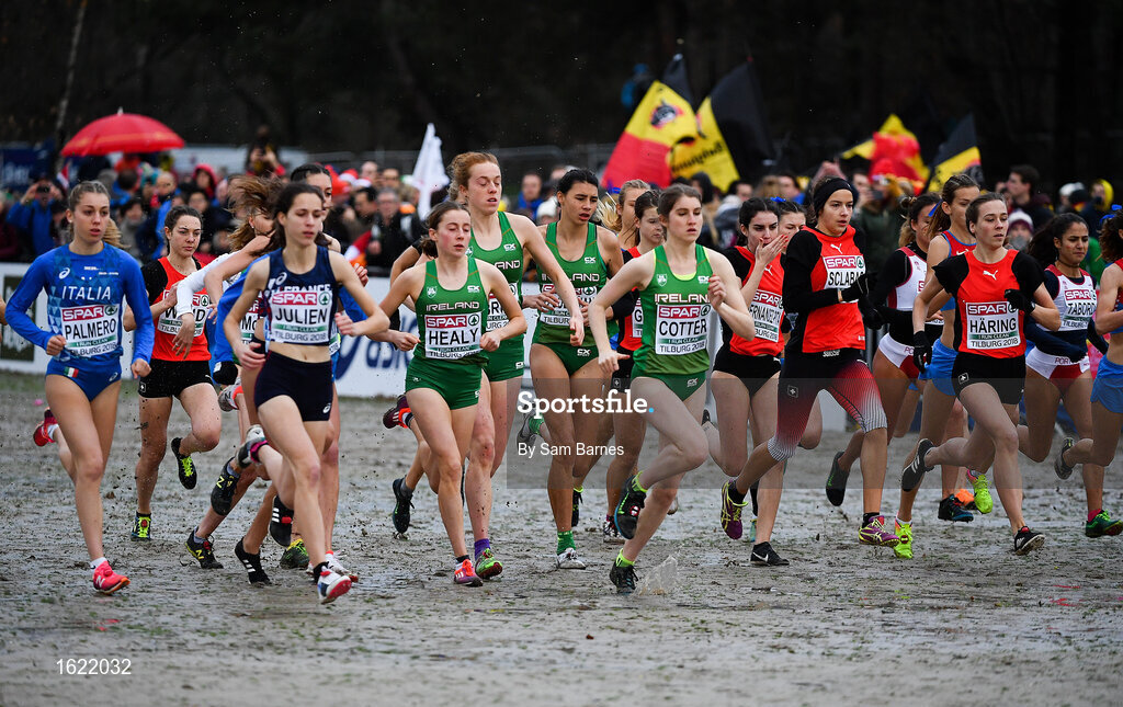 9 December 2018; Ireland team, from left, Sarah Healy, Emma O'Brien, Sophie O'Sullivan, and Stephanie Cotter, competing in the U20 Women's event during the European Cross Country Championships at Beekse Bergen Safari Park in Tilburg, Netherlands. Photo by Sam Barnes/Sportsfile