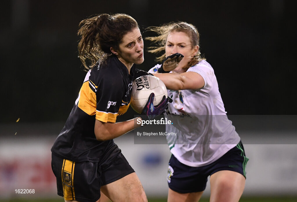 8 December 2018; Ciara O'Sullivan of Mourneabbey in action against Sarah Quinn of Foxrock-Cabinteely during the All-Ireland Ladies Football Senior Club Championship Final match between Foxrock-Cabinteely, Dublin, and Mourneabbey, Cork, at Parnell Park in Dublin. Photo by Stephen McCarthy/Sportsfile