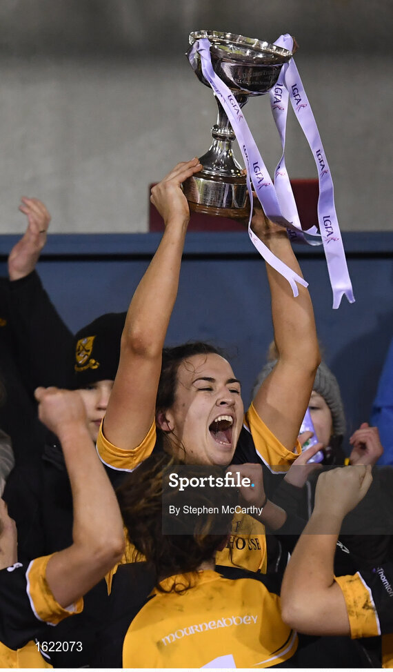 8 December 2018; Mourneabbey captain Brid O'Sullivan lifts the Dolores Tyrrell Memorial Cup following the All-Ireland Ladies Football Senior Club Championship Final match between Foxrock-Cabinteely, Dublin, and Mourneabbey, Cork, at Parnell Park in Dublin. Photo by Stephen McCarthy/Sportsfile