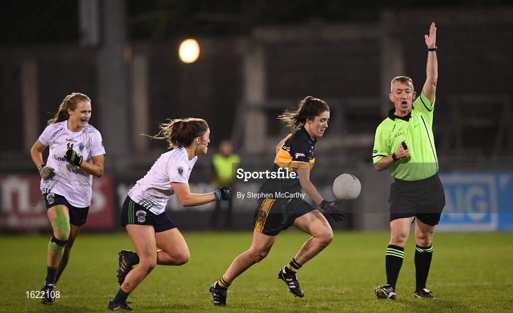 8 December 2018; Referee Brendan Rice signals for Ciara O'Sullivan of Mourneabbey to continue with the play during the All-Ireland Ladies Football Senior Club Championship Final match between Foxrock-Cabinteely, Dublin, and Mourneabbey, Cork, at Parnell Park in Dublin. Photo by Stephen McCarthy/Sportsfile