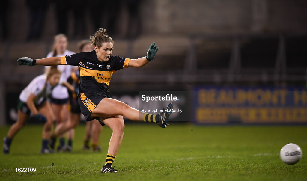 8 December 2018; Eimear Harrington of Mourneabbey strikes a penalty during the All-Ireland Ladies Football Senior Club Championship Final match between Foxrock-Cabinteely, Dublin, and Mourneabbey, Cork, at Parnell Park in Dublin. Photo by Stephen McCarthy/Sportsfile