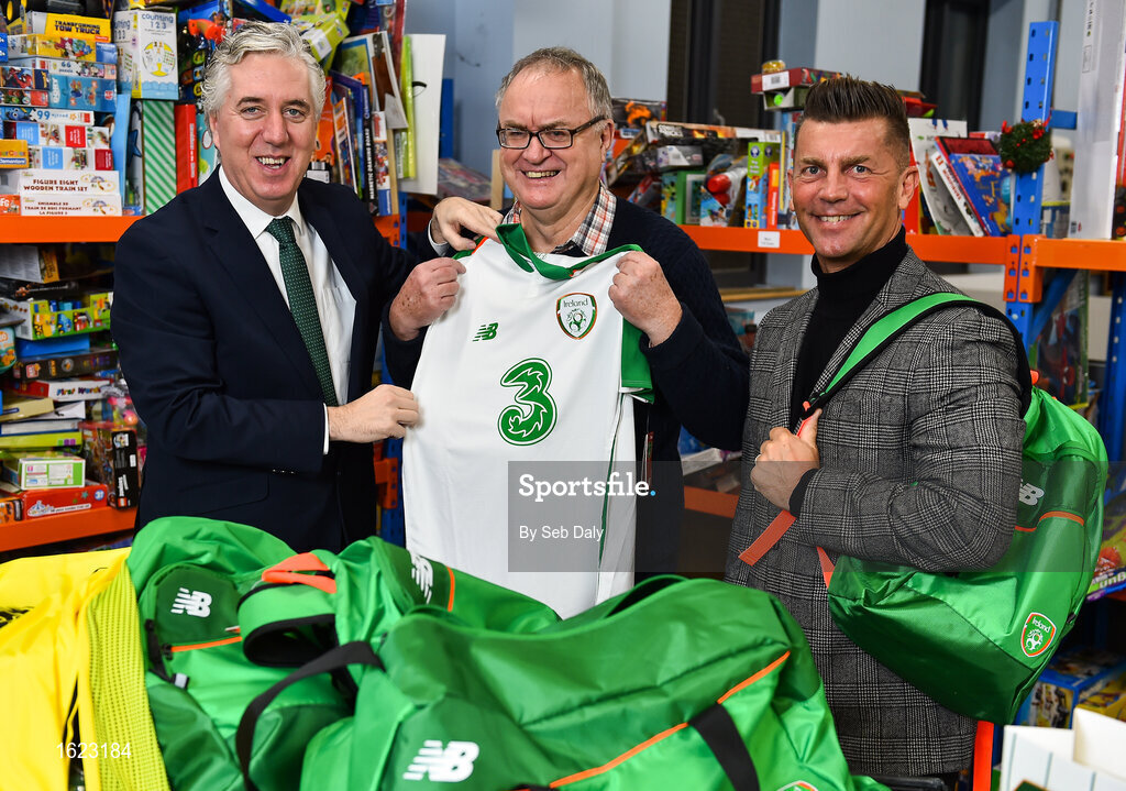 12 December 2018; FAI CEO John Delaney, left, along with Republic of Ireland Women’s National Team manager Colin Bell, right, were on hand today to hand over Ireland bags filled with jerseys, footballs, scarfs & other merchandise to Liam Casey, centre, East Region President, St Vincent De Paul, at the St Vincent De Paul depot on Sean McDermott Street, Dublin. The gifts are part of an annual Christmas donation for families in need. Photo by Seb Daly/Sportsfile