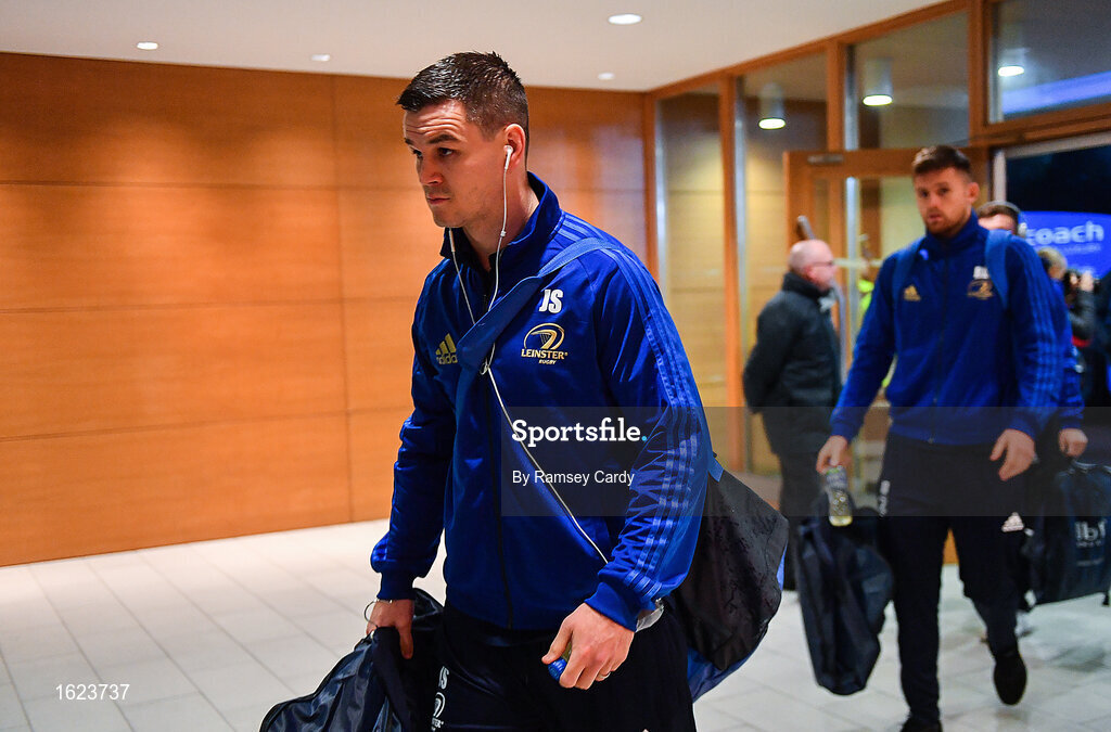 15 December 2018; Jonathan Sexton, left, and Ross Byrne of Leinster arrives ahead of the Heineken Champions Cup Pool 1 Round 4 match between Leinster and Bath at the Aviva Stadium in Dublin. Photo by Ramsey Cardy/Sportsfile