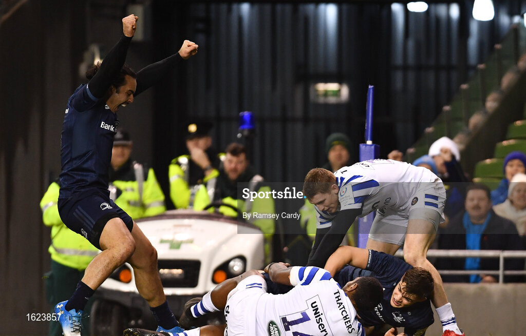 15 December 2018; James Lowe, left, and Garry Ringrose of Leinster celebrate a try by Jack Conan, hidden, during the Heineken Champions Cup Pool 1 Round 4 match between Leinster and Bath at the Aviva Stadium in Dublin. Photo by Ramsey Cardy/Sportsfile