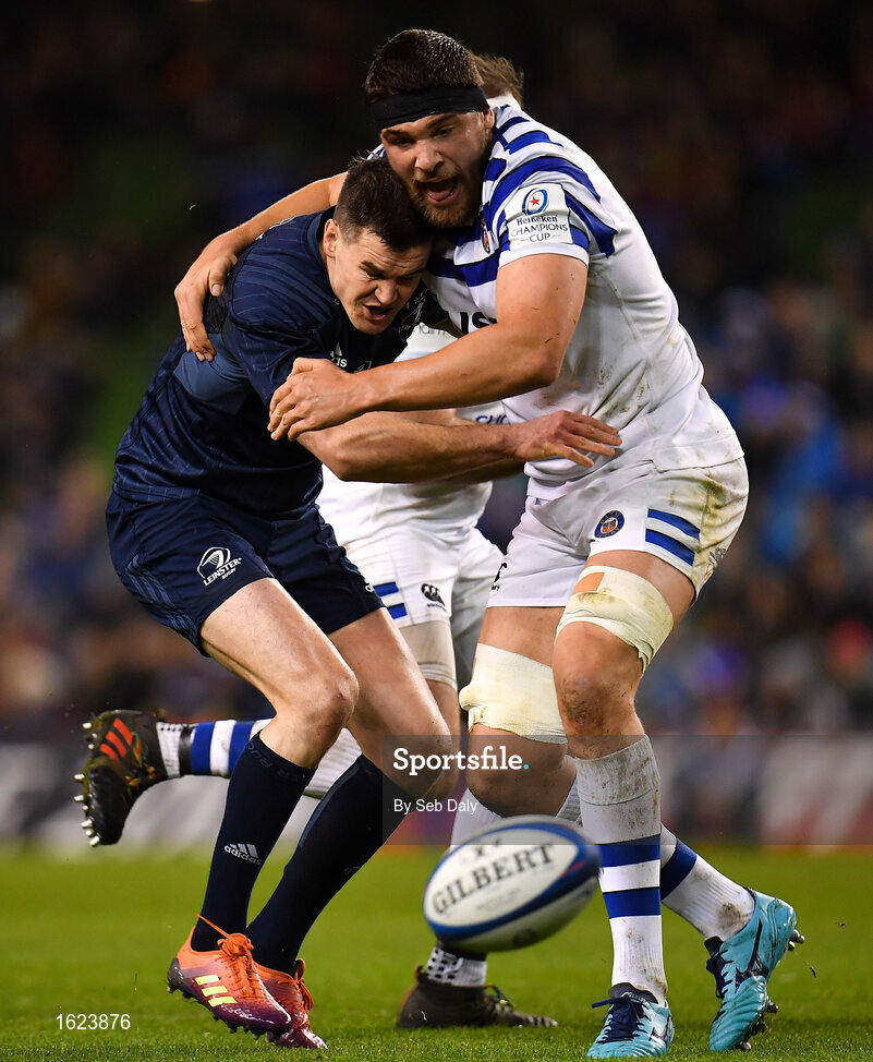 15 December 2018; Jonathan Sexton of Leinster is tackled by Charlie Ewels of Bath during the Heineken Champions Cup Pool 1 Round 4 match between Leinster and Bath at the Aviva Stadium in Dublin. Photo by Seb Daly/Sportsfile