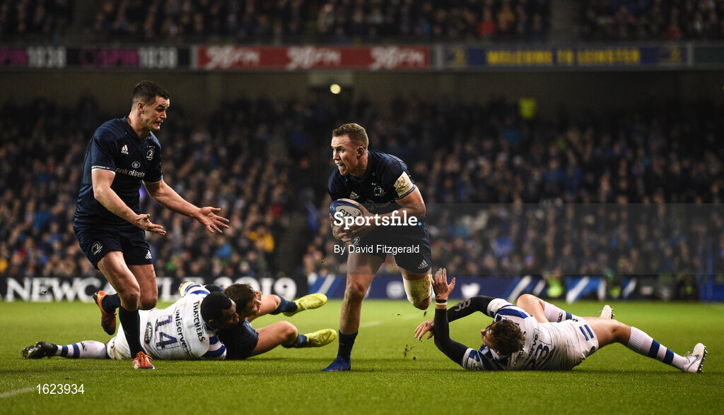 15 December 2018; Rory O'Loughlin supported by teammate Jonathan Sexton of Leinster escapes the tackle of Darren Atkins of Bath during the Heineken Champions Cup Pool 1 Round 4 match between Leinster and Bath at the Aviva Stadium in Dublin. Photo by David Fitzgerald/Sportsfile