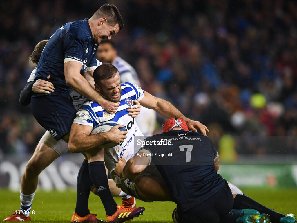 15 December 2018; Jamie Roberts of Bath is tackled by Jonathan Sexton, left, and Josh van der Flier of Leinster during the Heineken Champions Cup Pool 1 Round 4 match between Leinster and Bath at the Aviva Stadium in Dublin. Photo by David Fitzgerald/Sportsfile