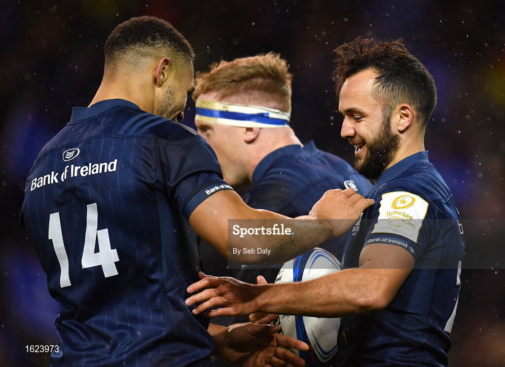 15 December 2018; Jamison Gibson-Park of Leinster, right, is congratulated by team-mate Adam Byrne after scoring his side's sixth try during the Heineken Champions Cup Pool 1 Round 4 match between Leinster and Bath at the Aviva Stadium in Dublin. Photo by Seb Daly/Sportsfile