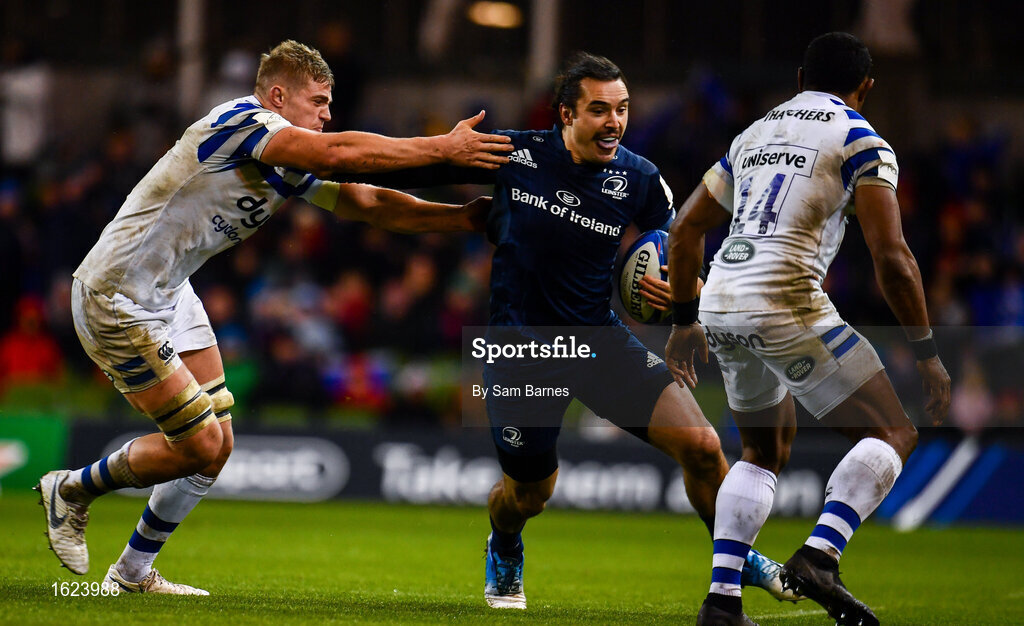 15 December 2018; James Lowe of Leinster in action against Tom Ellis, left, and Semesa Rokoduguni of Bath during the Heineken Champions Cup Pool 1 Round 4 match between Leinster and Bath at the Aviva Stadium in Dublin. Photo by Sam Barnes/Sportsfile