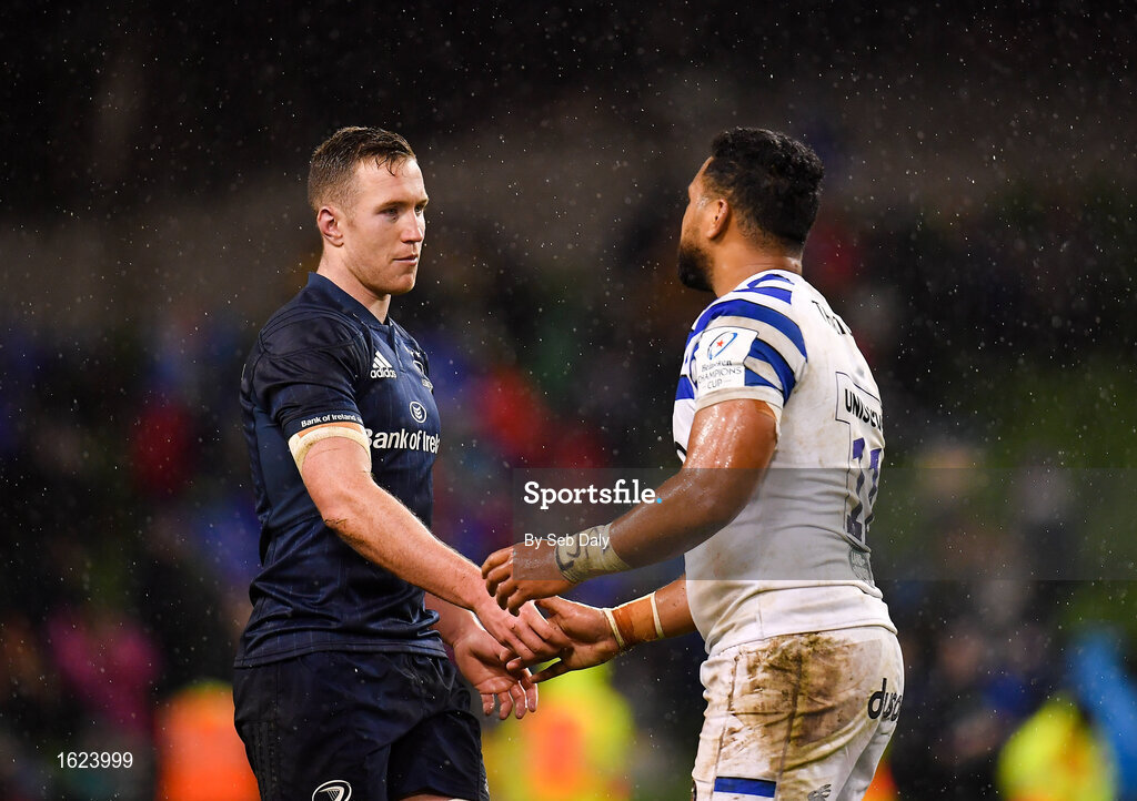 15 December 2018; Rory O’Loughlin of Leinster and Cooper Vuna of Bath shake hands following the Heineken Champions Cup Pool 1 Round 4 match between Leinster and Bath at the Aviva Stadium in Dublin. Photo by Seb Daly/Sportsfile