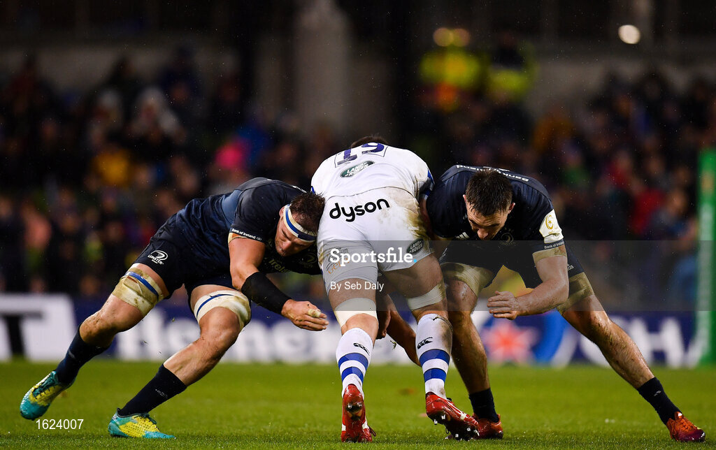 15 December 2018; Elliott Stooke of Bath is tackled by Rhys Ruddock, left, and Jack Conan of Leinster during the Heineken Champions Cup Pool 1 Round 4 match between Leinster and Bath at the Aviva Stadium in Dublin. Photo by Seb Daly/Sportsfile