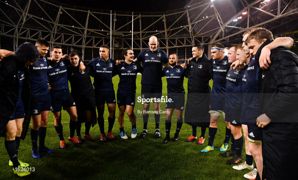 15 December 2018; The Leinster team huddle following the Heineken Champions Cup Pool 1 Round 4 match between Leinster and Bath at the Aviva Stadium in Dublin. Photo by Ramsey Cardy/Sportsfile