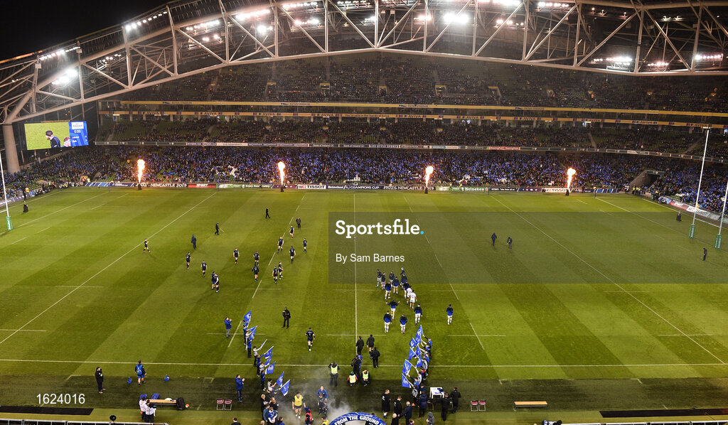 15 December 2018; The teams make their way out ahead of the Heineken Champions Cup Pool 1 Round 4 match between Leinster and Bath at the Aviva Stadium in Dublin. Photo by Sam Barnes/Sportsfile