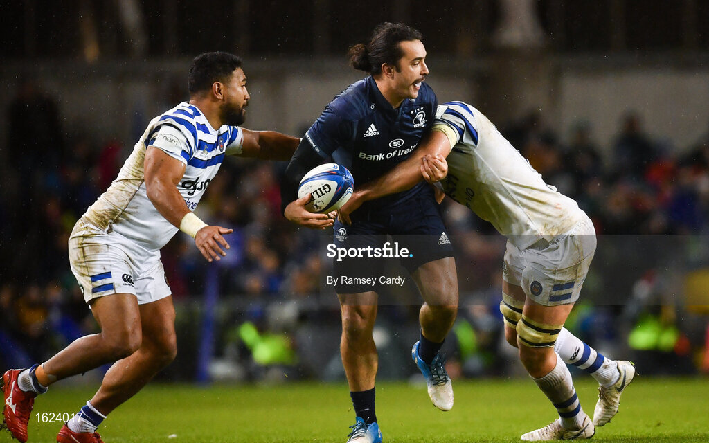 15 December 2018; James Lowe of Leinster is tackled by Cooper Vuna, left, and Tom Ellis of Bath during the Heineken Champions Cup Pool 1 Round 4 match between Leinster and Bath at the Aviva Stadium in Dublin. Photo by Ramsey Cardy/Sportsfile