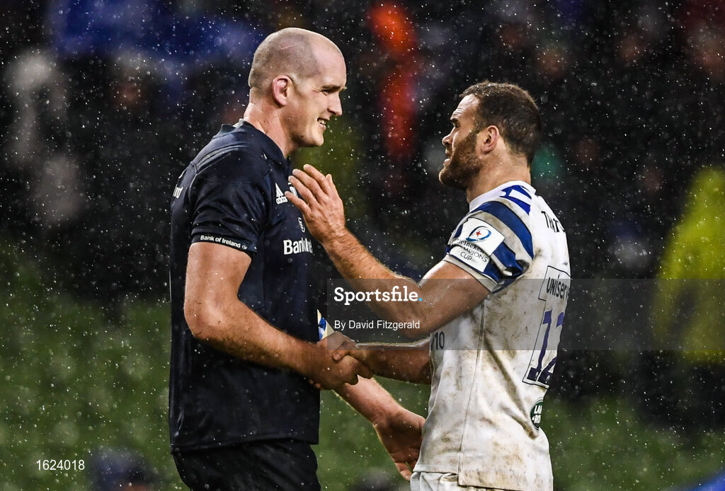 15 December 2018; Devin Toner of Leinster and Jamie Roberts of Bath following the Heineken Champions Cup Pool 1 Round 4 match between Leinster and Bath at the Aviva Stadium in Dublin. Photo by David Fitzgerald/Sportsfile