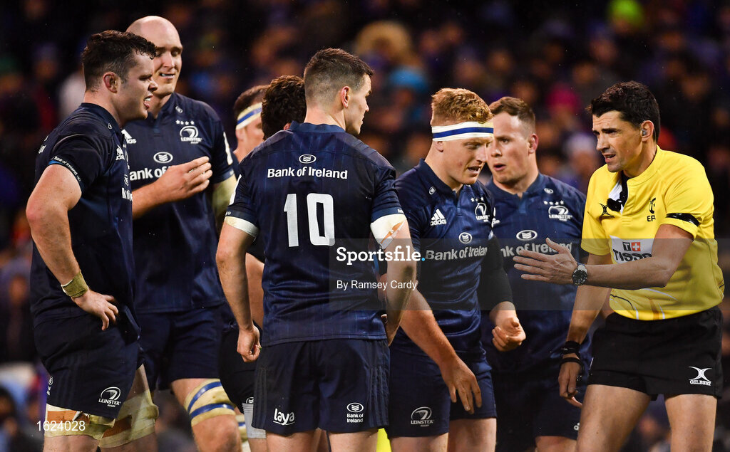 15 December 2018; Leinster captain Jonathan Sexton in conversation with referee Pascal Gauzère during the Heineken Champions Cup Pool 1 Round 4 match between Leinster and Bath at the Aviva Stadium in Dublin. Photo by Ramsey Cardy/Sportsfile