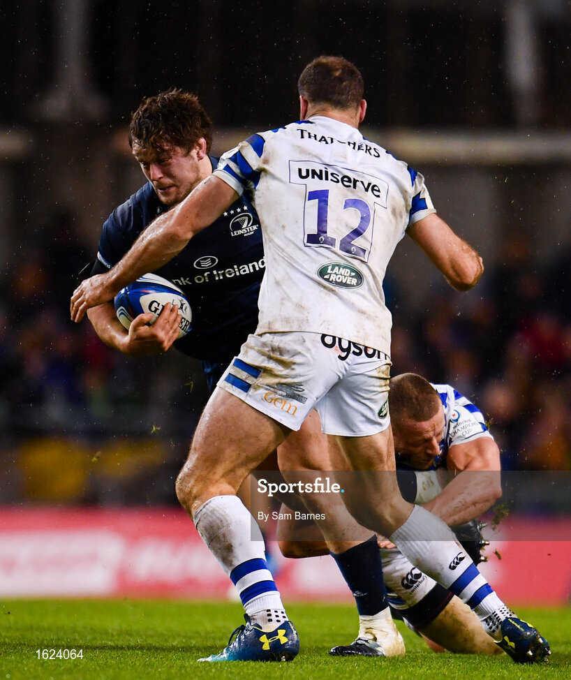 15 December 2018; Andrew Porter of Leinster is tackled by Max Lahiff, right, and Jamie Roberts of Bath during the Heineken Champions Cup Pool 1 Round 4 match between Leinster and Bath at the Aviva Stadium in Dublin. Photo by Sam Barnes/Sportsfile