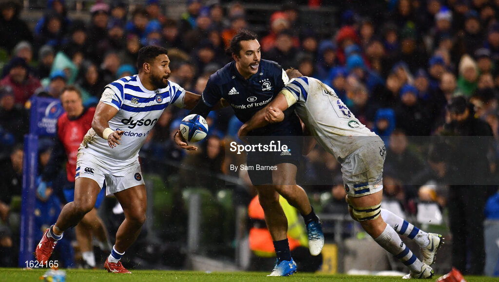 15 December 2018; James Lowe of Leinster is tackled by Tom Ellis, right, and Semesa Rokoduguni of Bath during the Heineken Champions Cup Pool 1 Round 4 match between Leinster and Bath at the Aviva Stadium in Dublin. Photo by Sam Barnes/Sportsfile