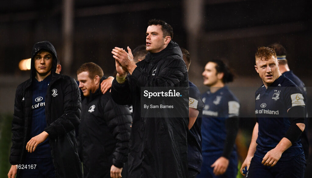 15 December 2018; Garry Ringrose, James Ryan and James Tracy of Leinster acknowledge the supporters following the Heineken Champions Cup Pool 1 Round 4 match between Leinster and Bath at the Aviva Stadium in Dublin. Photo by Sam Barnes/Sportsfile