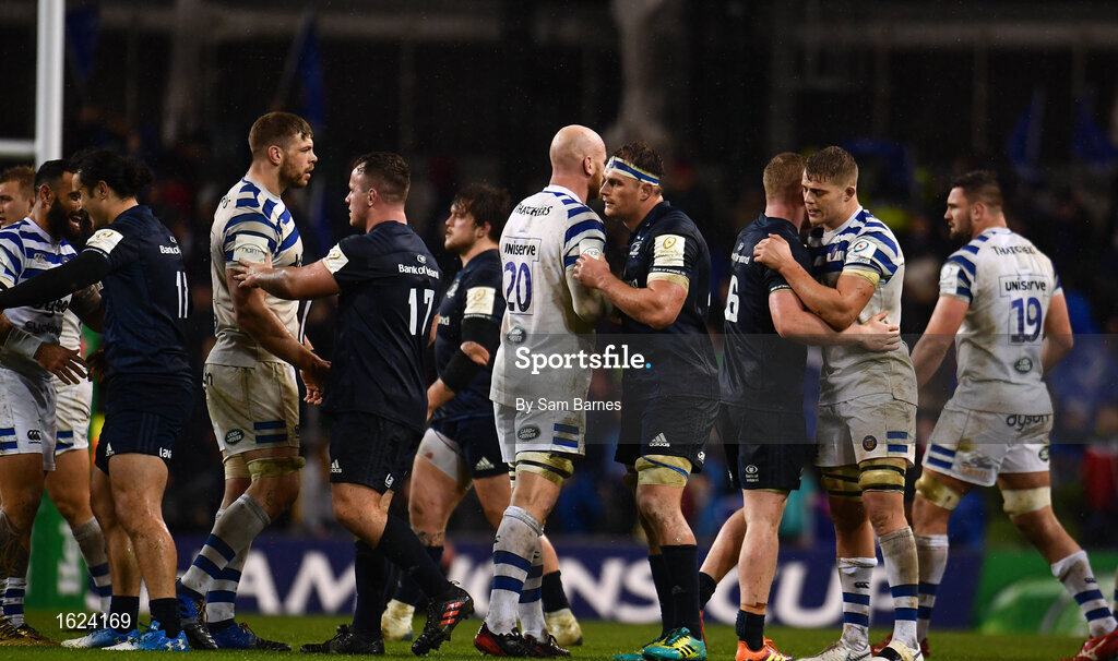 15 December 2018; Players from both sides shake hands following the Heineken Champions Cup Pool 1 Round 4 match between Leinster and Bath at the Aviva Stadium in Dublin. Photo by Sam Barnes/Sportsfile