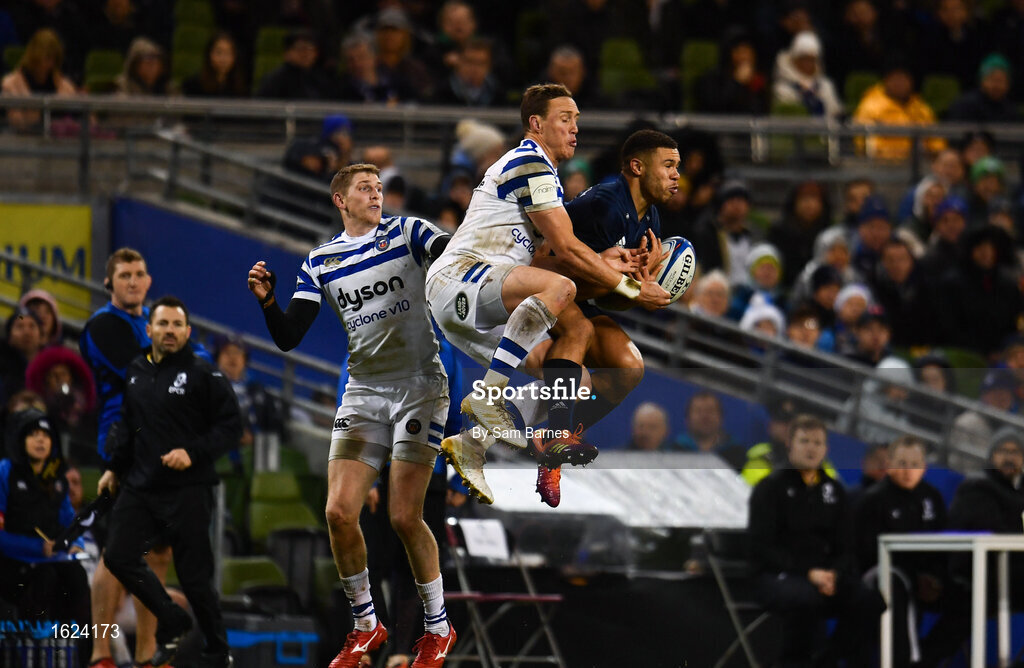 15 December 2018; Adam Byrne of Leinster in action against James Wilson of Bath during the Heineken Champions Cup Pool 1 Round 4 match between Leinster and Bath at the Aviva Stadium in Dublin. Photo by Sam Barnes/Sportsfile