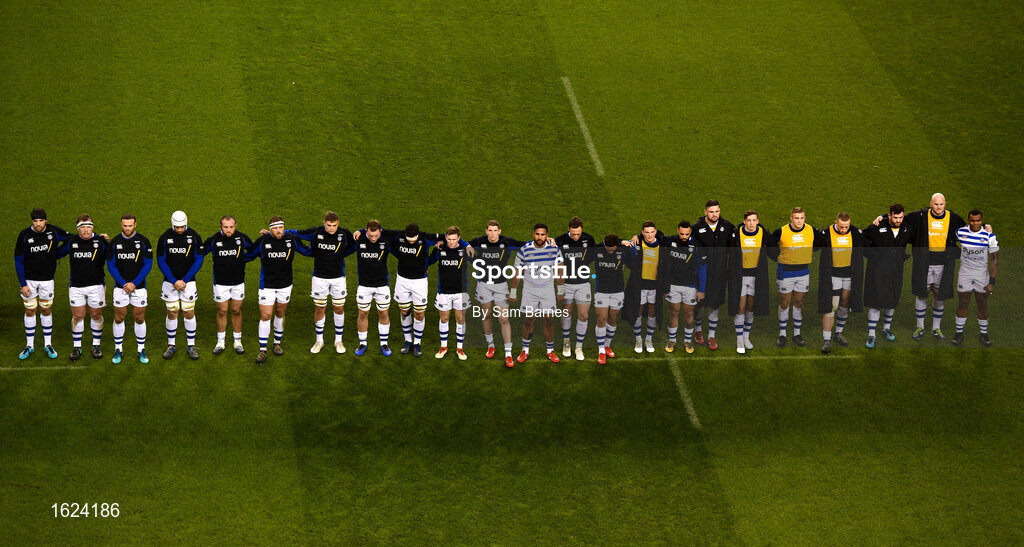 15 December 2018; Bath players observe a minute's silence in honour of Stade Francais' Nicolas Chauvin, who passed away during the week following a neck injury sustained in a tackle, prior to the Heineken Champions Cup Pool 1 Round 4 match between Leinster and Bath at the Aviva Stadium in Dublin. Photo by Sam Barnes/Sportsfile