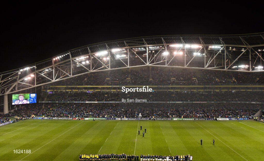 15 December 2018; Players and officials observe a minute's silence in honour of Stade Francais' Nicolas Chauvin, who passed away during the week following a neck injury sustained in a tackle, prior to the Heineken Champions Cup Pool 1 Round 4 match between Leinster and Bath at the Aviva Stadium in Dublin. Photo by Sam Barnes/Sportsfile