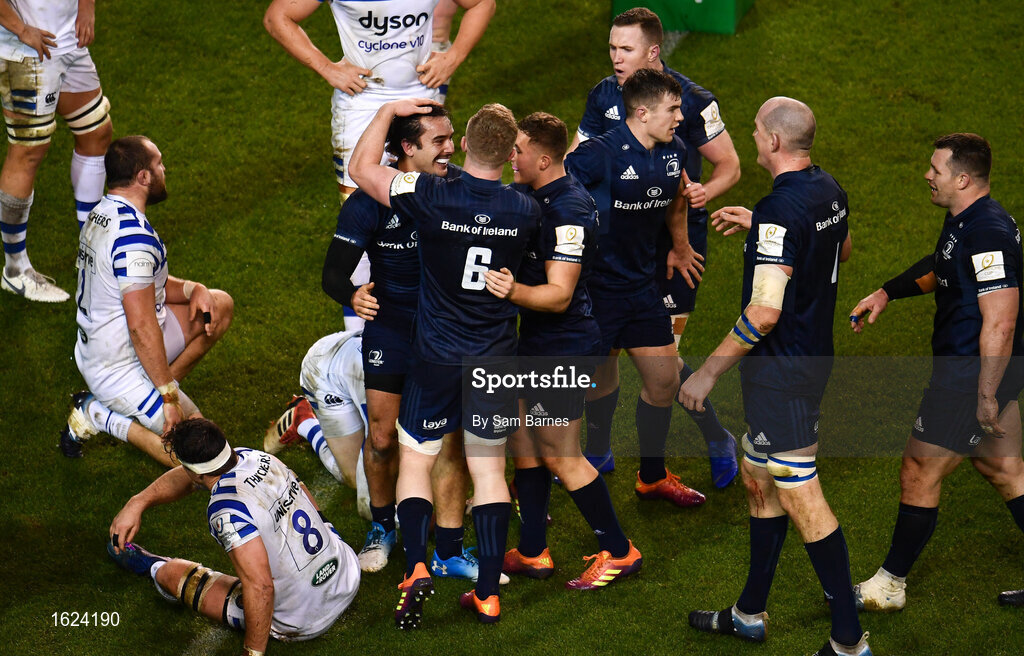 15 December 2018; James Lowe of Leinster celebrates after scoring his side's third try with teammates including Dan Leavy and Jordan Larmour during the Heineken Champions Cup Pool 1 Round 4 match between Leinster and Bath at the Aviva Stadium in Dublin. Photo by Sam Barnes/Sportsfile