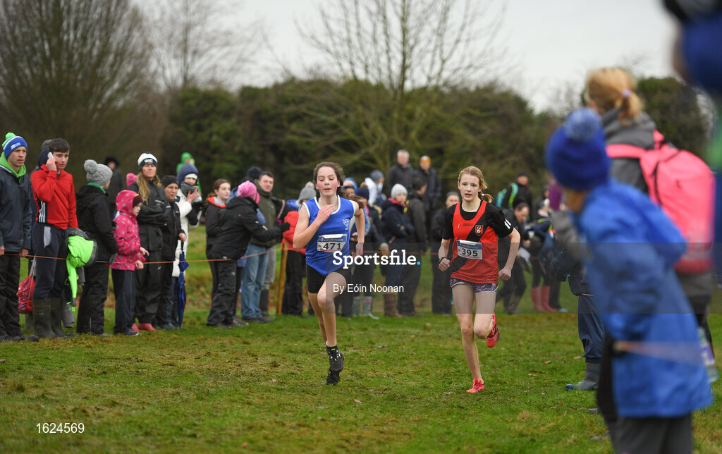 15 December 2018; Nicole Dinan of Leevale A.C., Co. Cork, and Saoirse Fitzgerald of Lucan Harriers A.C., Co. Dublin, competing in the U13 Girls event during the Irish Life Health Novice & Juvenile Uneven Age Cross Country Championships 2018 at Navan Adventure Sports, Navan Racecourse in Meath. Photo by Eóin Noonan/Sportsfile