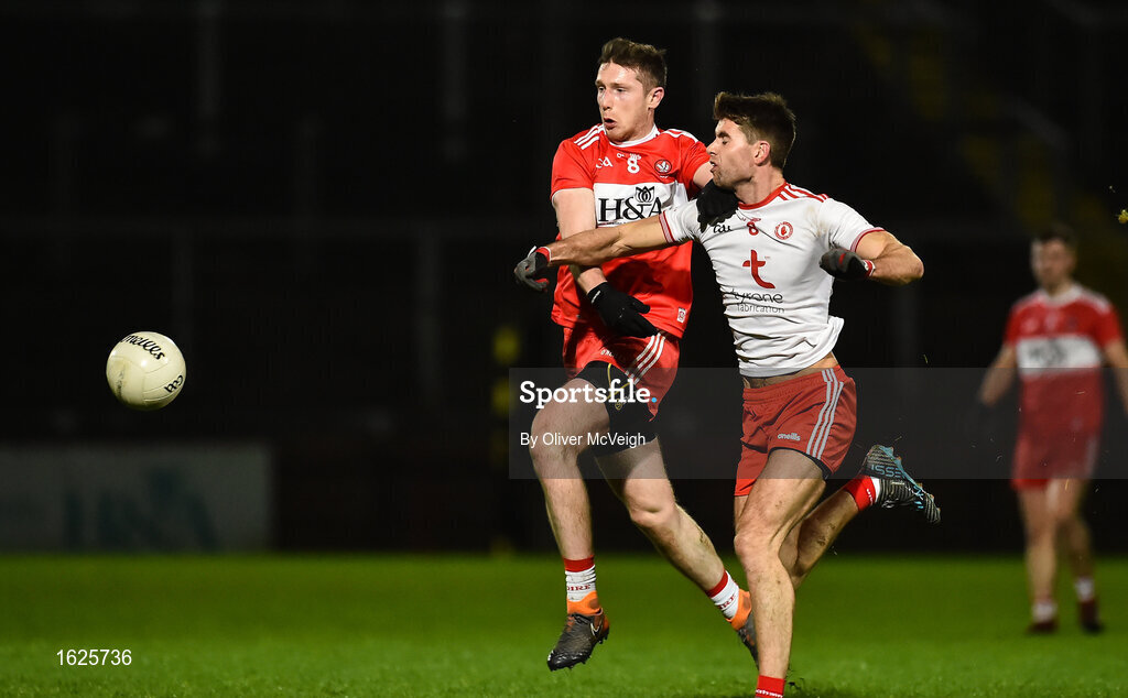 20 December 2018; Emmet Bradley of Derry in action against Conan Grugan of Tyrone during the Bank of Ireland Dr. McKenna Cup Round 1 match between Derry and Tyrone at Celtic Park, Derry. Photo by Oliver McVeigh/Sportsfile