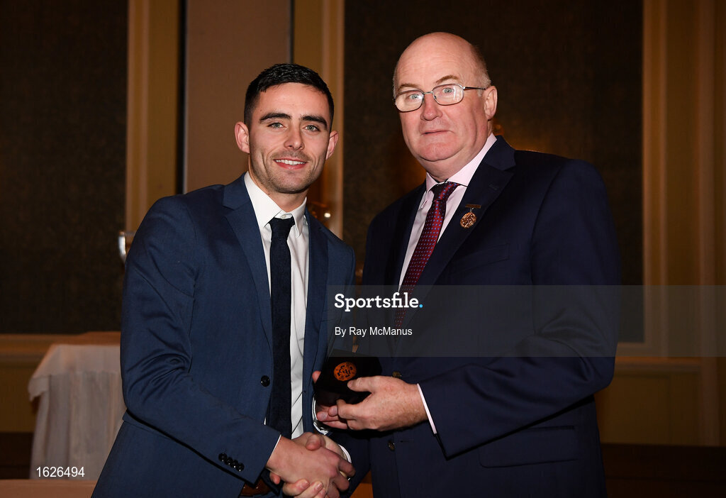 22 December 2018; Niall Scully of Dublin is presented with his GAA Football All-Ireland Senior Championship medal by Uachtarán Chumann Lúthchleas Gael John Horan at the InterContinental Dublin, Simmonscourt Road, Ballsbridge, Dublin Photo by Ray McManus/Sportsfile