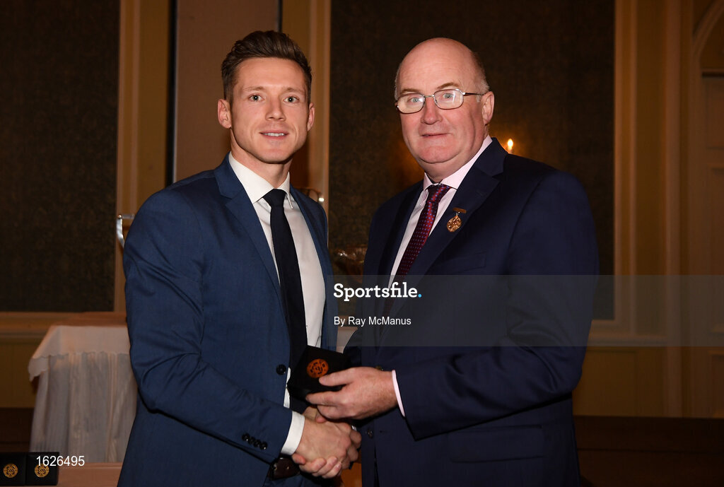 22 December 2018; Paul Flynn of Dublin is presented with his GAA Football All-Ireland Senior Championship medal by Uachtarán Chumann Lúthchleas Gael John Horan at the InterContinental Dublin, Simmonscourt Road, Ballsbridge, Dublin Photo by Ray McManus/Sportsfile