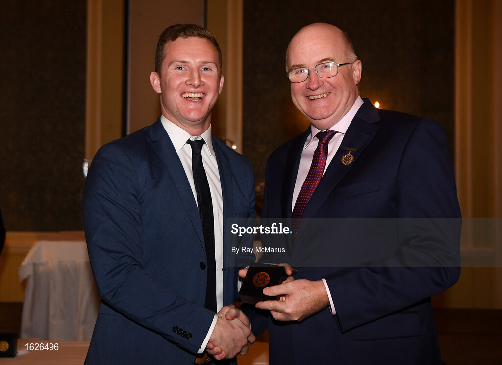 22 December 2018; Ciarán Kilkenny of Dublin is presented with his GAA Football All-Ireland Senior Championship medal by Uachtarán Chumann Lúthchleas Gael John Horan at the InterContinental Dublin, Simmonscourt Road, Ballsbridge, Dublin Photo by Ray McManus/Sportsfile