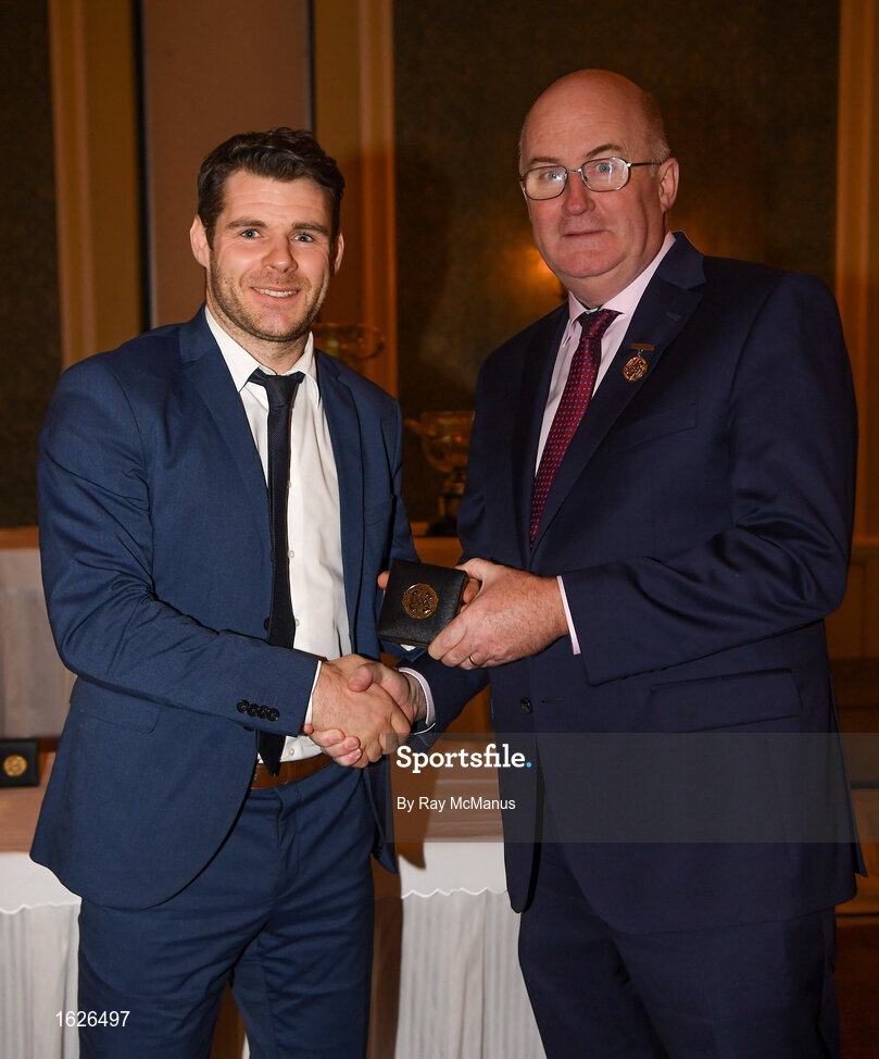 22 December 2018; Kevin McMenamon of Dublin is presented with his GAA Football All-Ireland Senior Championship medal by Uachtarán Chumann Lúthchleas Gael John Horan at the InterContinental Dublin, Simmonscourt Road, Ballsbridge, Dublin Photo by Ray McManus/Sportsfile