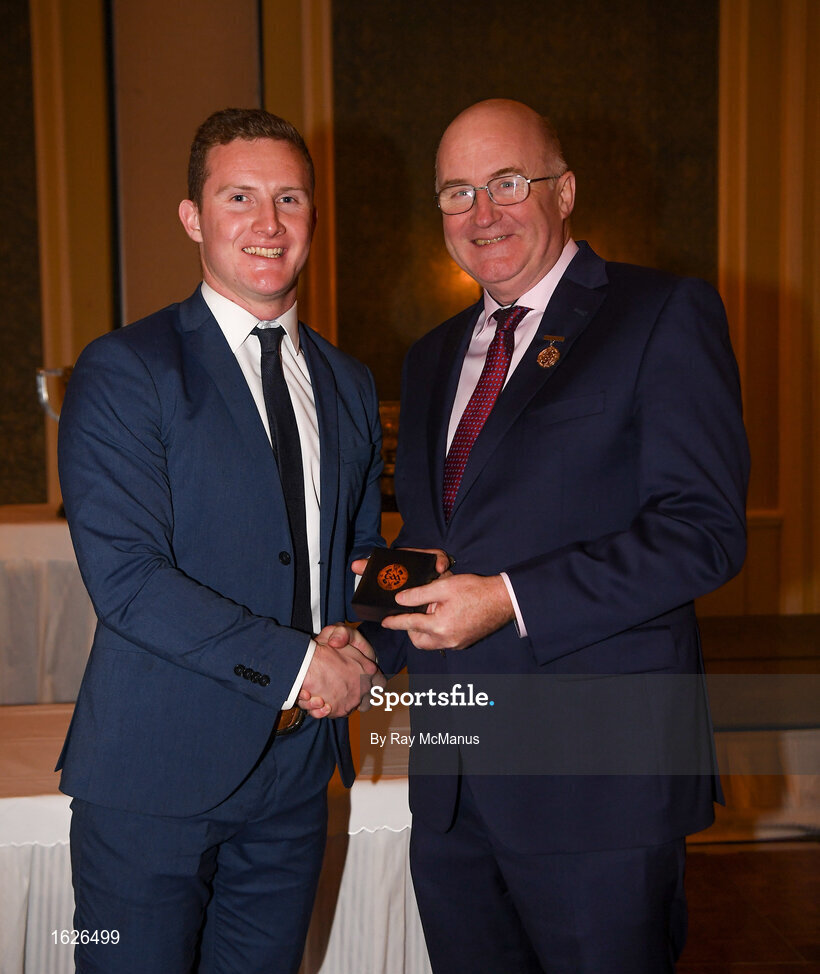 22 December 2018; Ciarán Kilkenny of Dublin is presented with his GAA Football All-Ireland Senior Championship medal by Uachtarán Chumann Lúthchleas Gael John Horan at the InterContinental Dublin, Simmonscourt Road, Ballsbridge, Dublin Photo by Ray McManus/Sportsfile