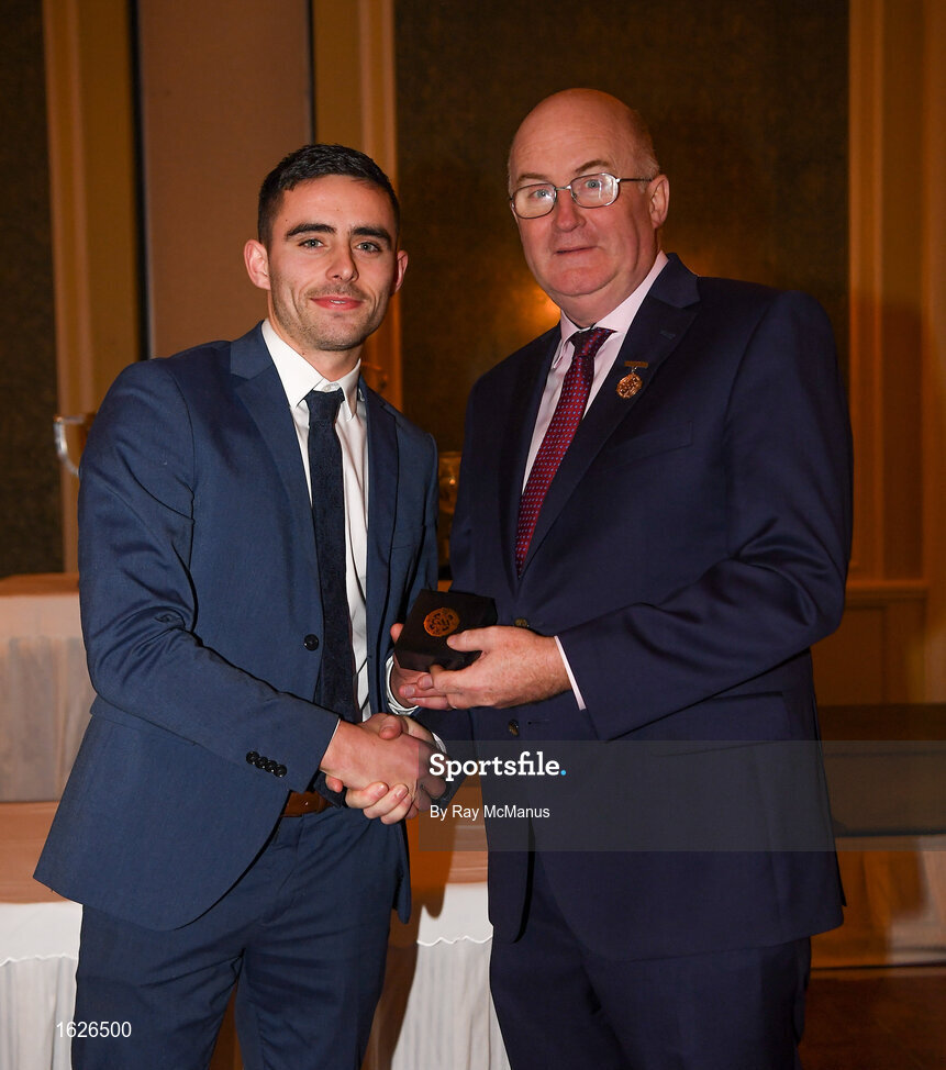 22 December 2018; Niall Scully of Dublin is presented with his GAA Football All-Ireland Senior Championship medal by Uachtarán Chumann Lúthchleas Gael John Horan at the InterContinental Dublin, Simmonscourt Road, Ballsbridge, Dublin Photo by Ray McManus/Sportsfile