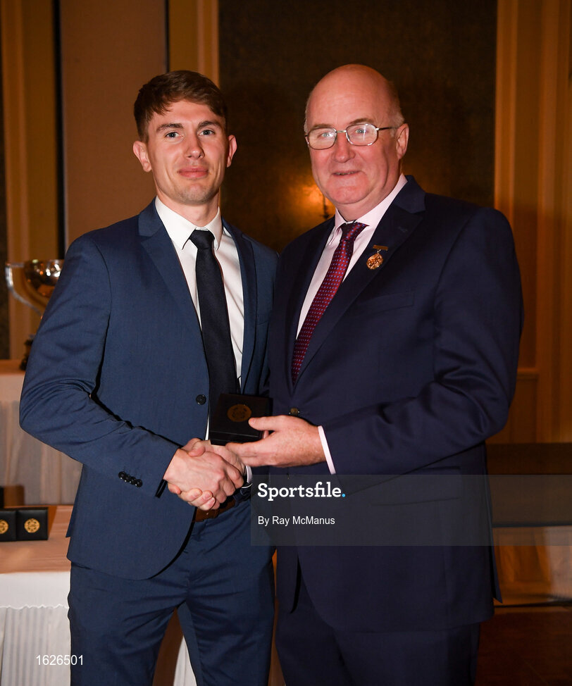 22 December 2018; Michael Fitzsimons of Dublin is presented with his GAA Football All-Ireland Senior Championship medal by Uachtarán Chumann Lúthchleas Gael John Horan at the InterContinental Dublin, Simmonscourt Road, Ballsbridge, Dublin Photo by Ray McManus/Sportsfile