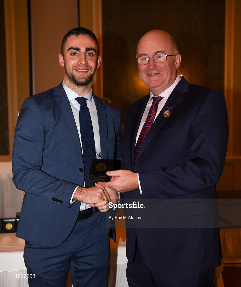 22 December 2018; James McCarthy of Dublin is presented with his GAA Football All-Ireland Senior Championship medal by Uachtarán Chumann Lúthchleas Gael John Horan at the InterContinental Dublin, Simmonscourt Road, Ballsbridge, Dublin Photo by Ray McManus/Sportsfile