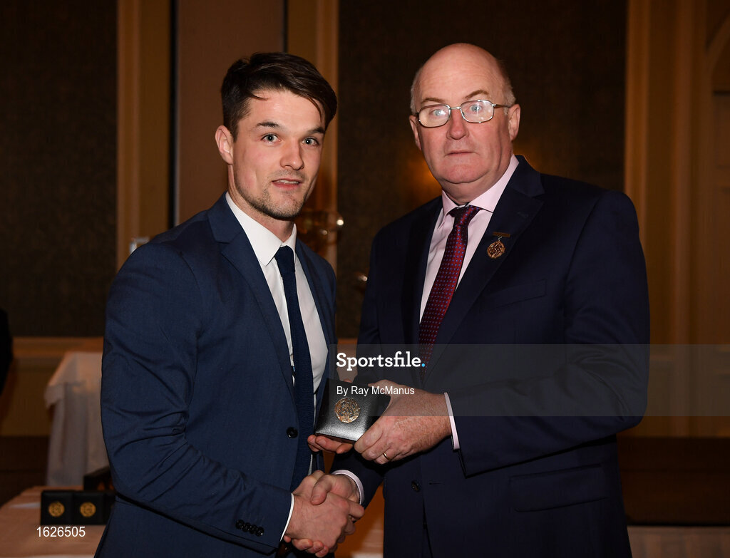 22 December 2018; Eric Lowndes of Dublin is presented with his GAA Football All-Ireland Senior Championship medal by Uachtarán Chumann Lúthchleas Gael John Horan at the InterContinental Dublin, Simmonscourt Road, Ballsbridge, Dublin Photo by Ray McManus/Sportsfile