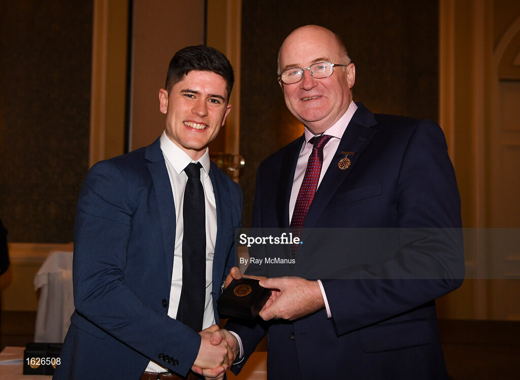 22 December 2018; Conor Mulally of Dublin is presented with his GAA Football All-Ireland Senior Championship medal by Uachtarán Chumann Lúthchleas Gael John Horan at the InterContinental Dublin, Simmonscourt Road, Ballsbridge, Dublin Photo by Ray McManus/Sportsfile