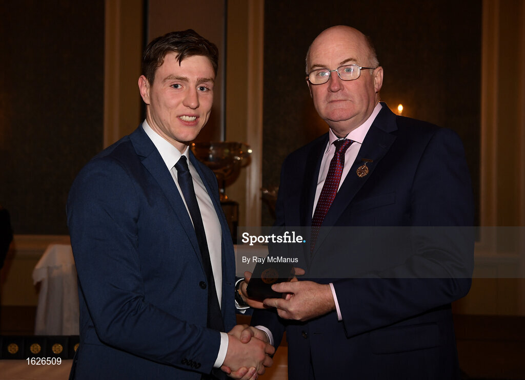 22 December 2018; James Small of Dublin is presented with his GAA Football All-Ireland Senior Championship medal by Uachtarán Chumann Lúthchleas Gael John Horan at the InterContinental Dublin, Simmonscourt Road, Ballsbridge, Dublin Photo by Ray McManus/Sportsfile