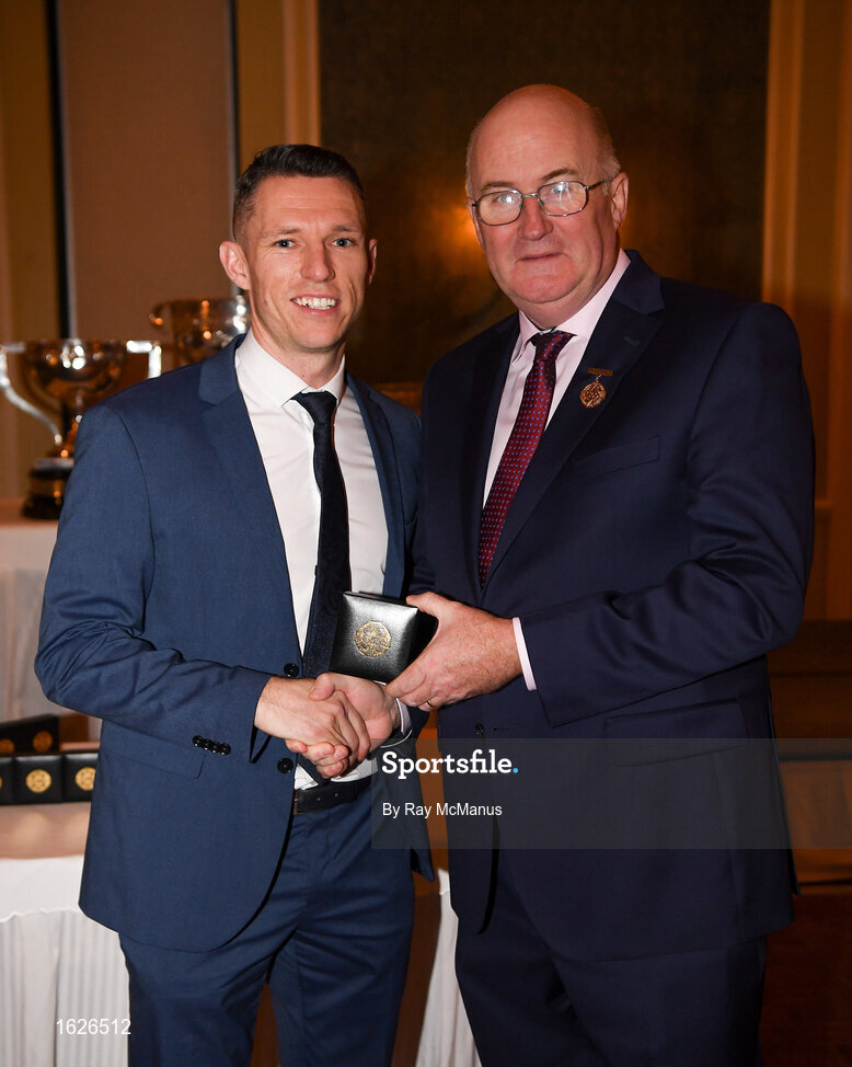 22 December 2018; Darren Daly of Dublin is presented with his GAA Football All-Ireland Senior Championship medal by Uachtarán Chumann Lúthchleas Gael John Horan at the InterContinental Dublin, Simmonscourt Road, Ballsbridge, Dublin Photo by Ray McManus/Sportsfile